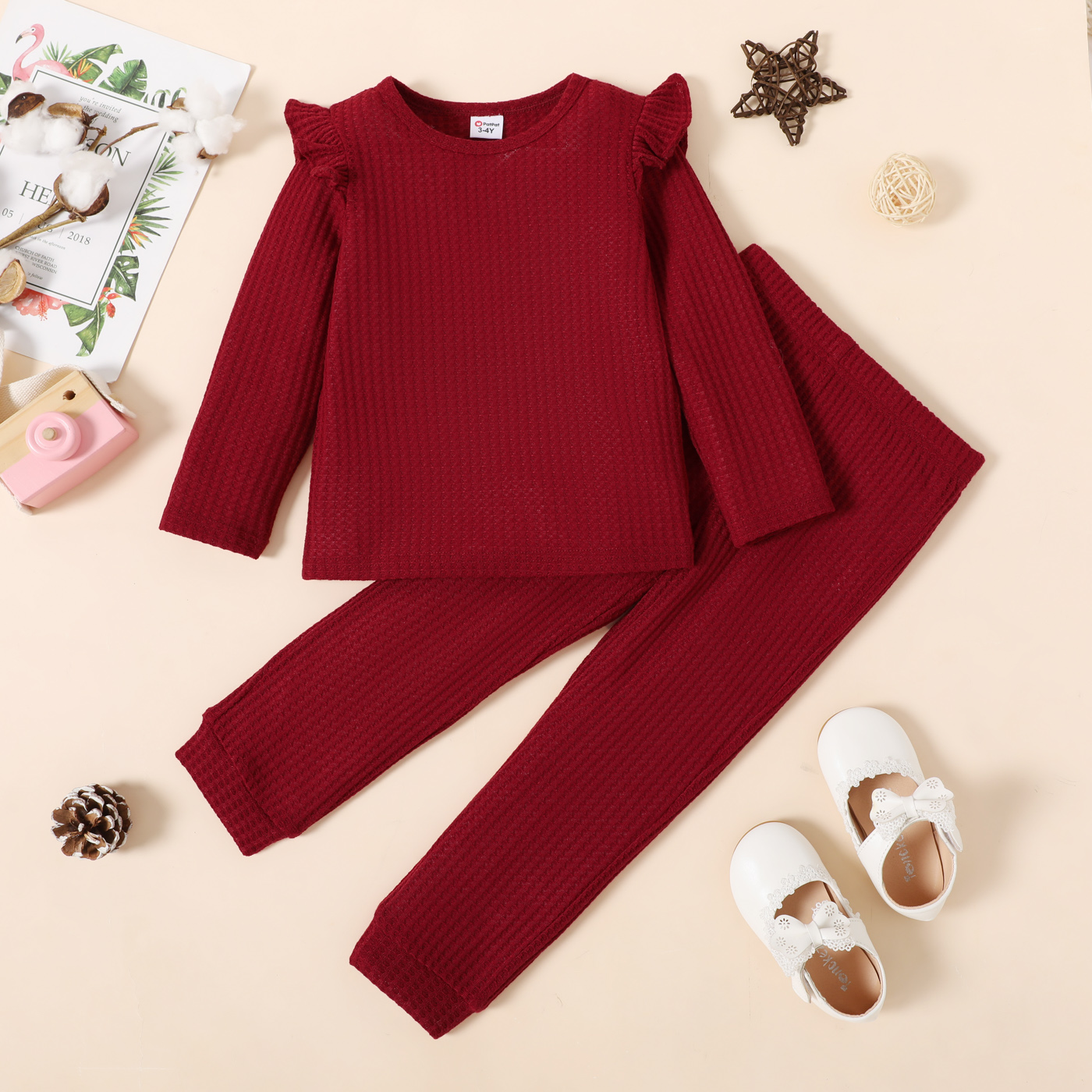 2-piece Toddler Girl Ruffled Textured Long-sleeve Top and Solid Color Pants Set