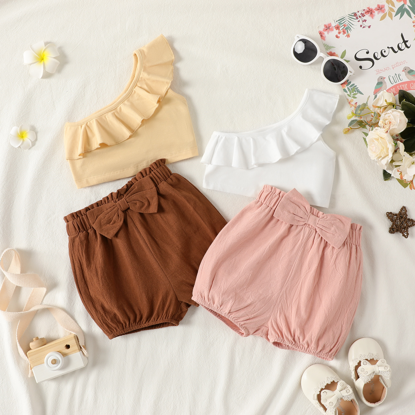 2pcs Baby Girl 100% Cotton Bow Front Shorts and One Shoulder Ruffle Trim Tank Top Set