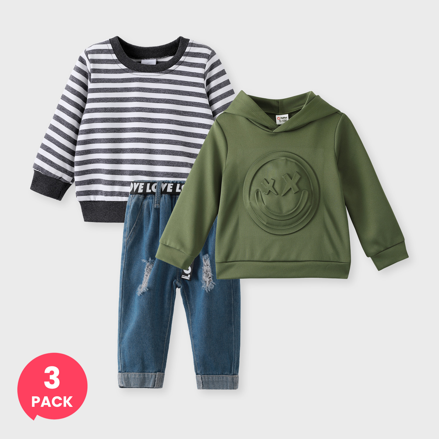 Product Introduction:A chic and stylish outfit perfect for any occasion.;Fabric:Green top - 97% polyester, 3% spandex. Stripe top - 35% cotton, 65% polyester. Jeans - 87% cotton, 10% viscose, 3% polyester.;Care Instruction:Machine wash cold, do not bleach, tumble dry low, cool iron, do not dry clean.;Key Features:* Product features - Full-print stripes, 3D graphic design, paired with jeans. * Fabric characteristics - Moderate. * Piece of product - 1 round neck sweatshirt, 1 hooded sweatshirt, 1 jeans. * Neckline - Regular. * Sleeves - Long. * Style - Chic and fashionable. * Fit - Moderate. * Length - Regular. * Source of goods - Imported. * Supplier - PatPat.;Additional information:Suitable for spring, outings, and daily wear. Designed with trendy and unique elements for an added charm.;