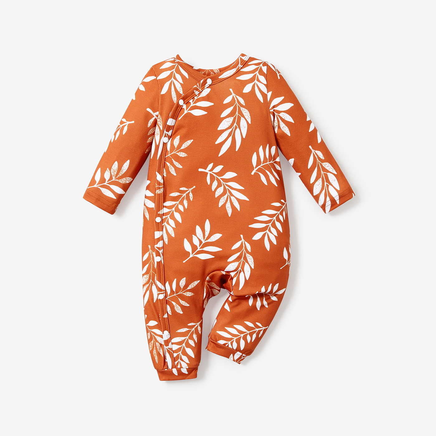 Baby Girl Leaves Print White/Brown Long-sleeve Jumpsuit