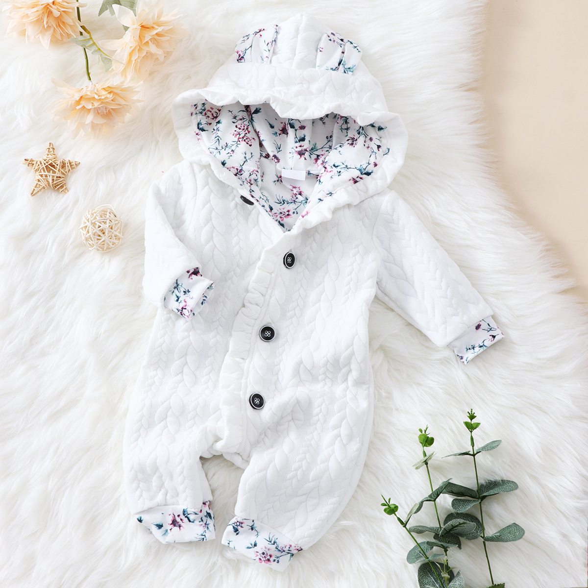 3D Ears Hooded Long-sleeve Ruffle Pink Thickened Lined Baby Jumpsuit