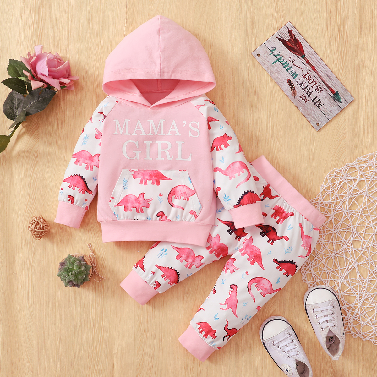 2pcs Baby Letter and Dinosaur Print Pink Long-sleeve Hoodie and Trousers Set