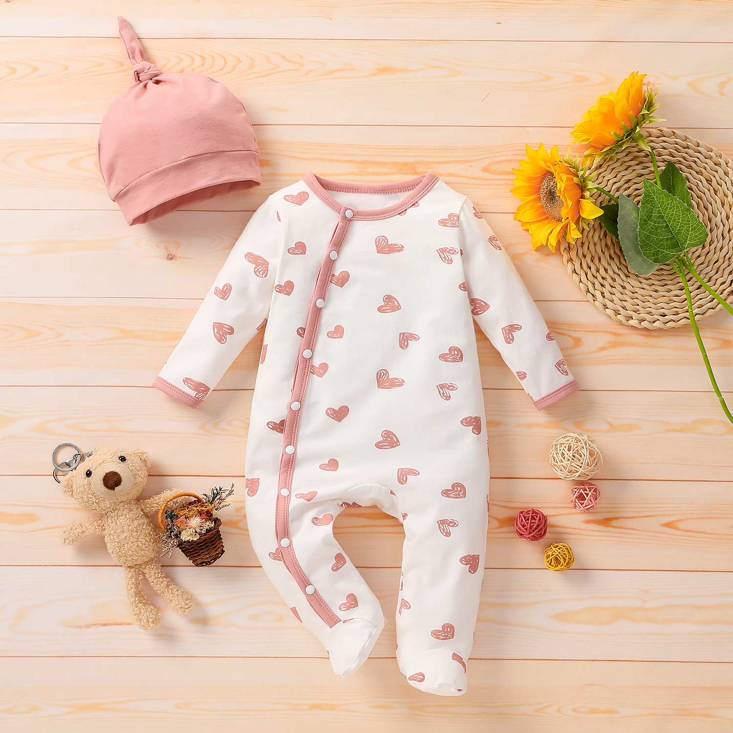 2pcs Baby Valentine's Day 95% Cotton Love Heart Print Footed Jumpsuit with Hat Set
