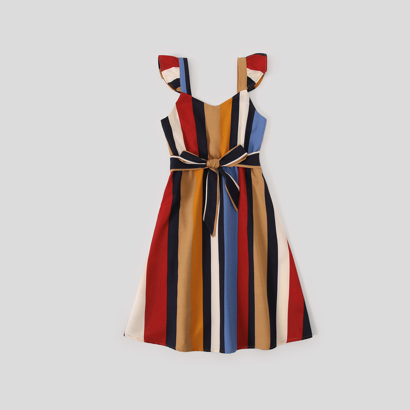 Family Matching Multicolor Striped V Neck Spaghetti Strap Belted Dresses and Colorblock Short-sleeve T-shirts Sets