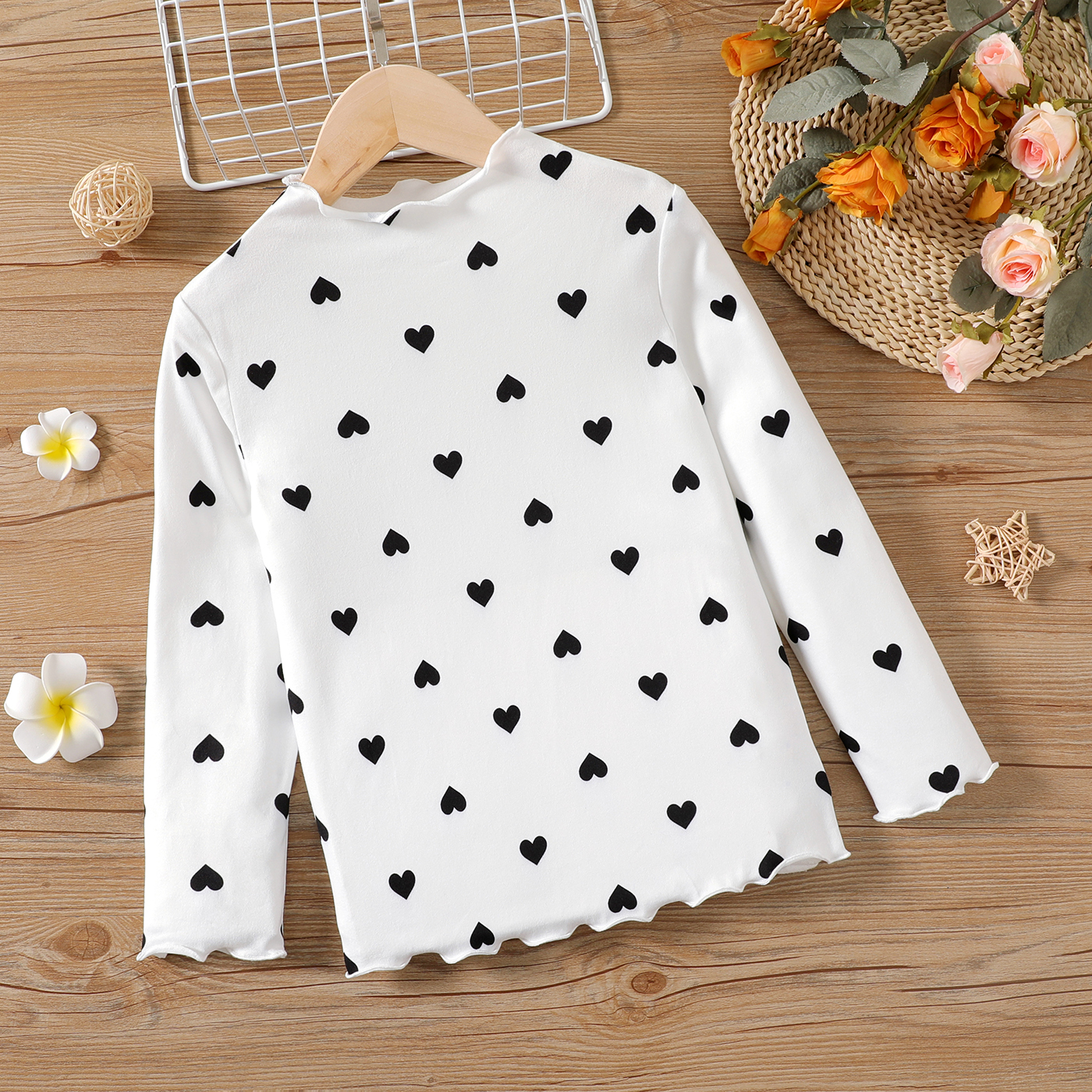 Kid Girl Heart Print Lettuce Trim Mock Neck Long-sleeve Tee