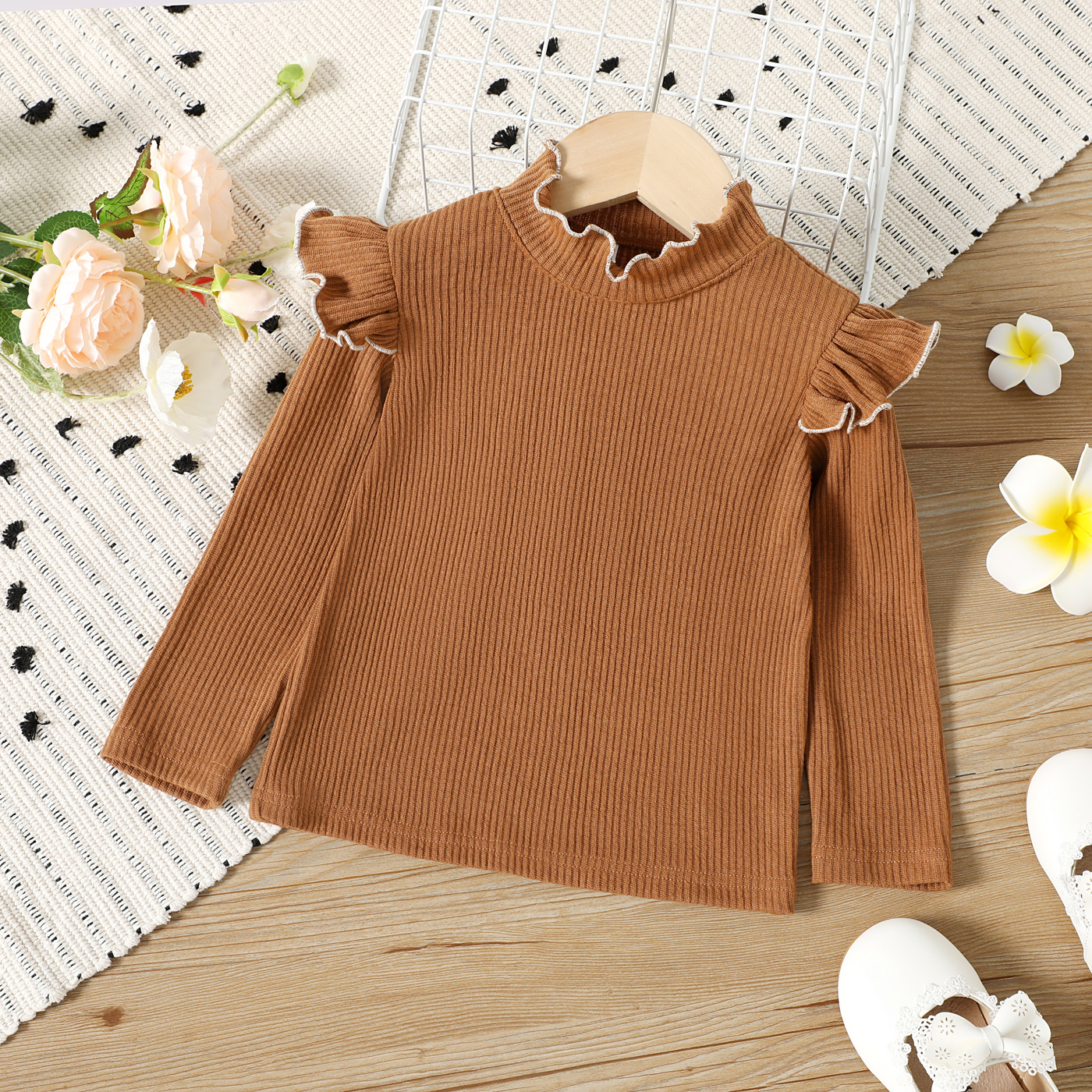 Toddler Girl Solid Color Ruffled Mock Neck Ribbed Long-sleeve Tee