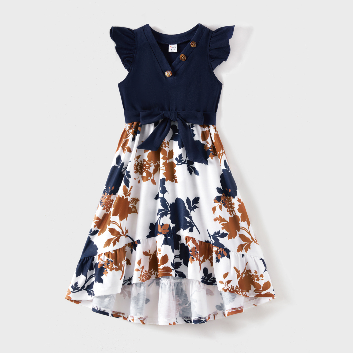 Product Introduction:Amp up your summer family look with these matching cotton colorblock T-shirts and flutter-sleeve floral print high low hem dresses set.;Fabric:T-shirt: 94% cotton and 6% Spandex fabric; Dress: 95% Polyester and 5% Spandex.;Care Instruction:These outfits are machine washable and can be tumble dried for easy and convenient maintenance.;Key Features:* Please add each size separately to your shopping cart. * Piece of product: A pack containing one high-low hem dress or one T-shirt in diverse sizes. * Fabric characteristics: Made of soft and breathable cotton blend fabric for a truly comfortable outing. * Neckline: V-neckline and ribbed collar for a stylish yet comfortable look. * Sleeves: Flutter sleeves for girls and short sleeves for everyone else. * Style: Designed with casual fabric stitching for any summer occasion. * Fit: Regular fit with a belted design for the dresses. * Length: The dresses reach the calf and below the knee for women and girls respectively, with knee-length fit for baby girls. * Source of goods: Imported from trusted suppliers worldwide. * Supplier: PatPat.;Additional Information:Perfect for summer family events and casual outings, this colorful fabric stitching design will make your family stand out from the crowd.;