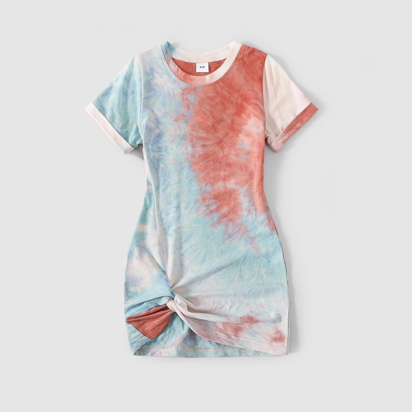 Family Matching Colorblock Tie Dye Twist Knot Bodycon Dresses and Short-sleeve T-shirts Sets