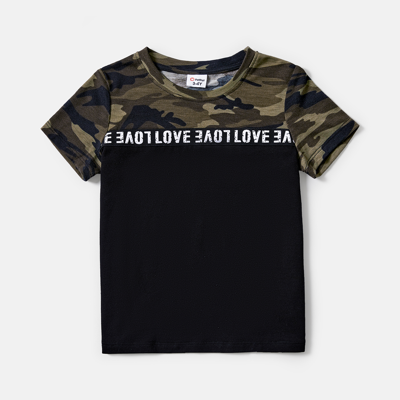 Family Matching Letter Design Camouflage Halter Neck Sleeveless Bodycon Dresses and Cotton Short-sleeve Spliced T-shirts Sets