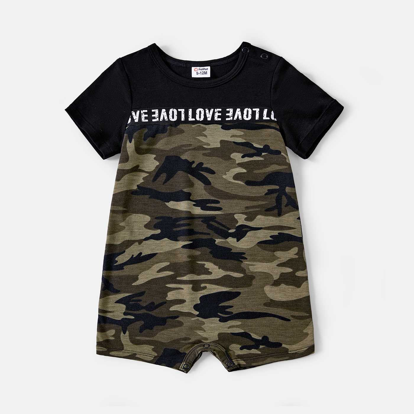 Family Matching Letter Design Camouflage Halter Neck Sleeveless Bodycon Dresses and Cotton Short-sleeve Spliced T-shirts Sets
