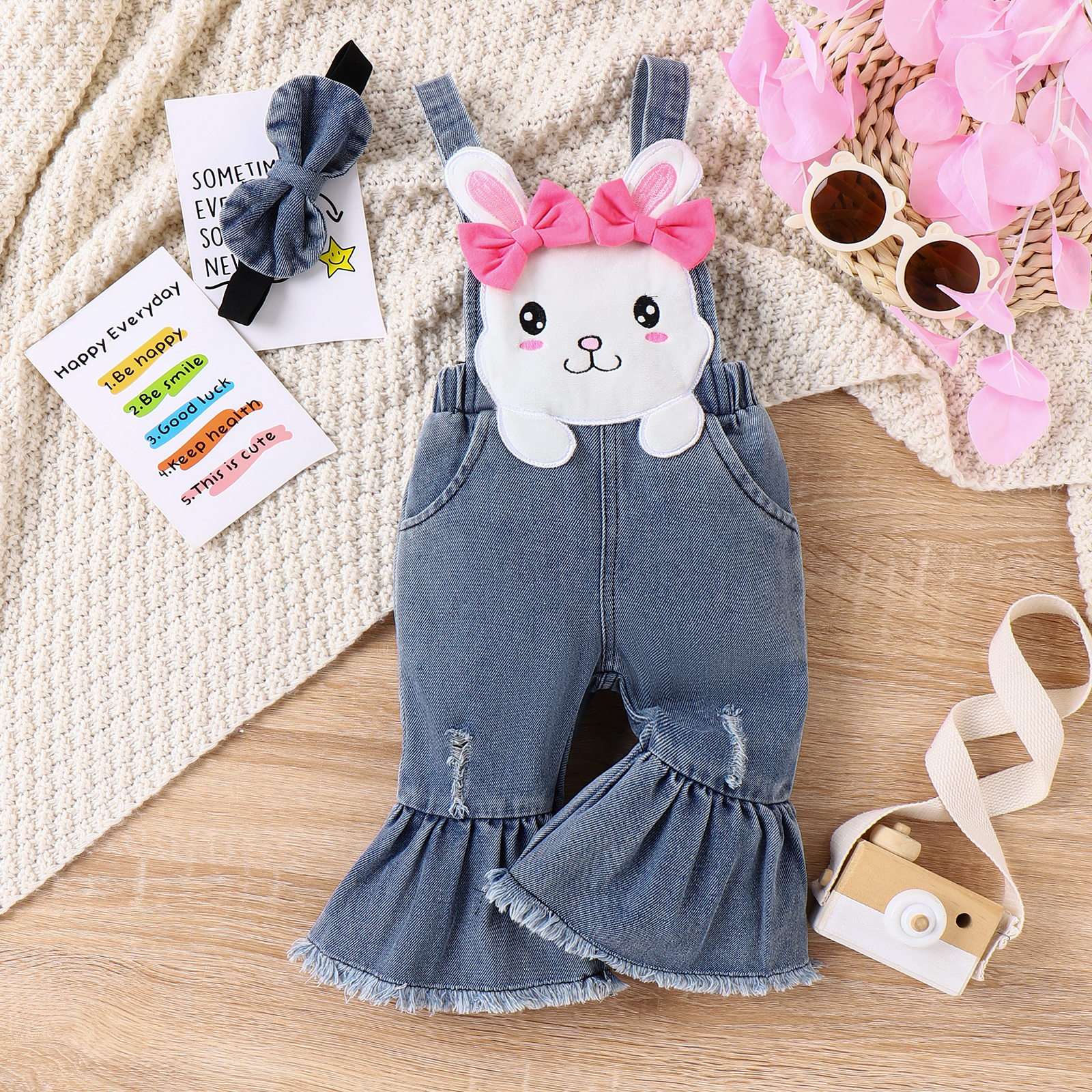 Baby Girl Ruffled Rib-knit Top and Denim 3D Bear Pattern Flared Overalls Set