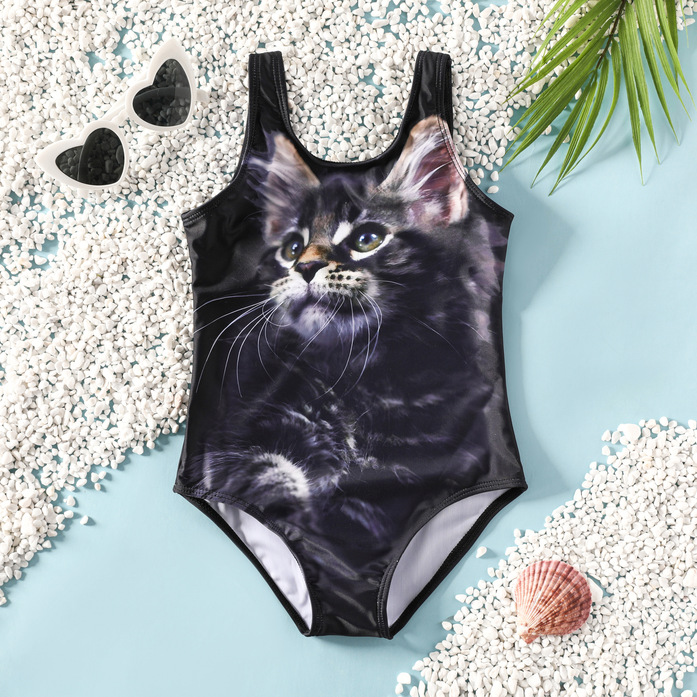 Childlike Black Cat Pattern Girl's Tight Swimsuit Set
