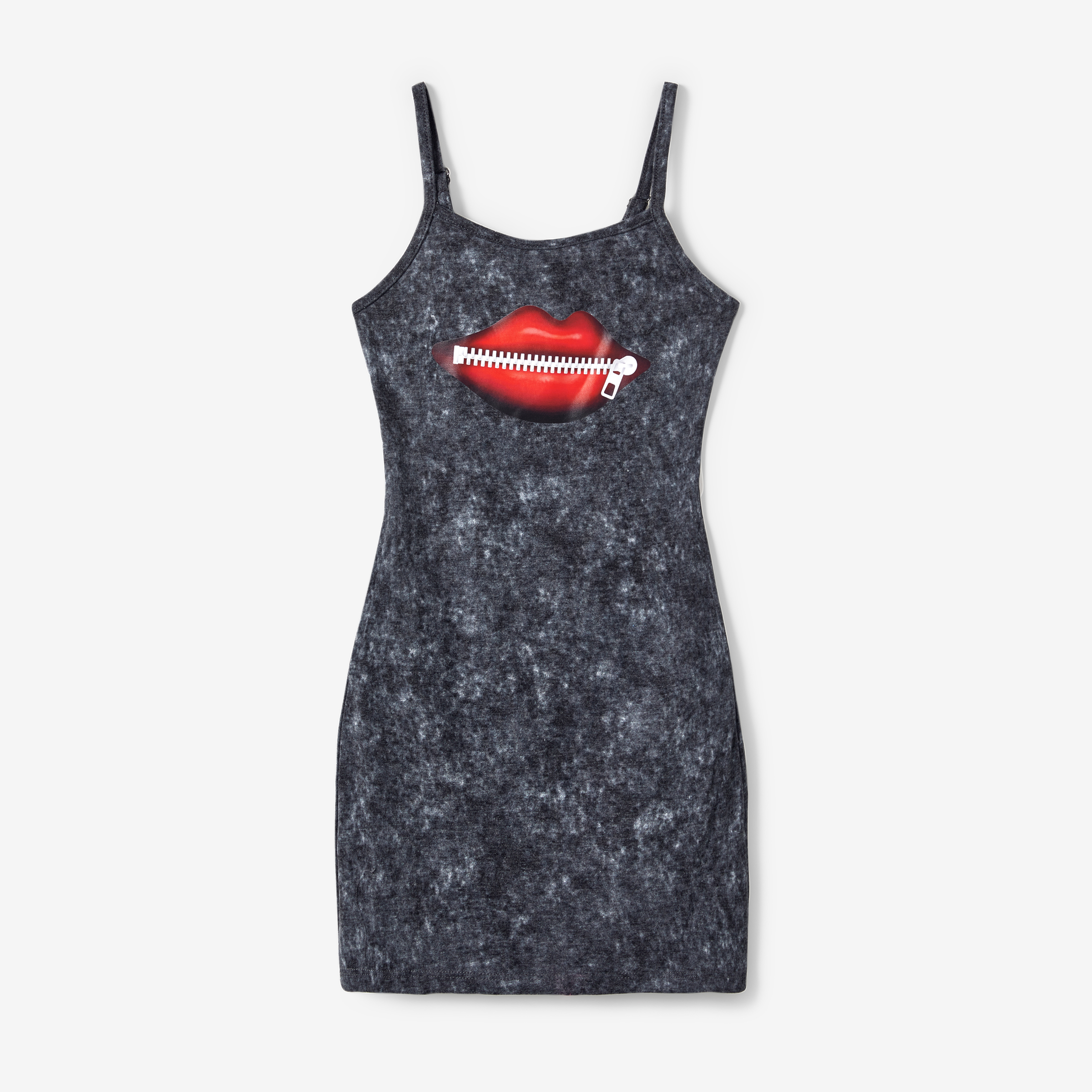 Product Introduction: Dress up with your little one in this chic dark grey mother daughter matching dress set featuring lip prints and zipper patterns to add a playful touch to your daily casual outfits.nFabric: Fabric Composition: 65% Polyester, 5% Spandex, 30% Viscose. Our unique snow wash fabric texture is soft and smooth to the touch, adding a vintage and stylish feel to the garment.nCare Instruction: Machine wash cold, do not bleach, low iron, do not dry clean.nKey Features: * Please add each size separately to your shopping cart