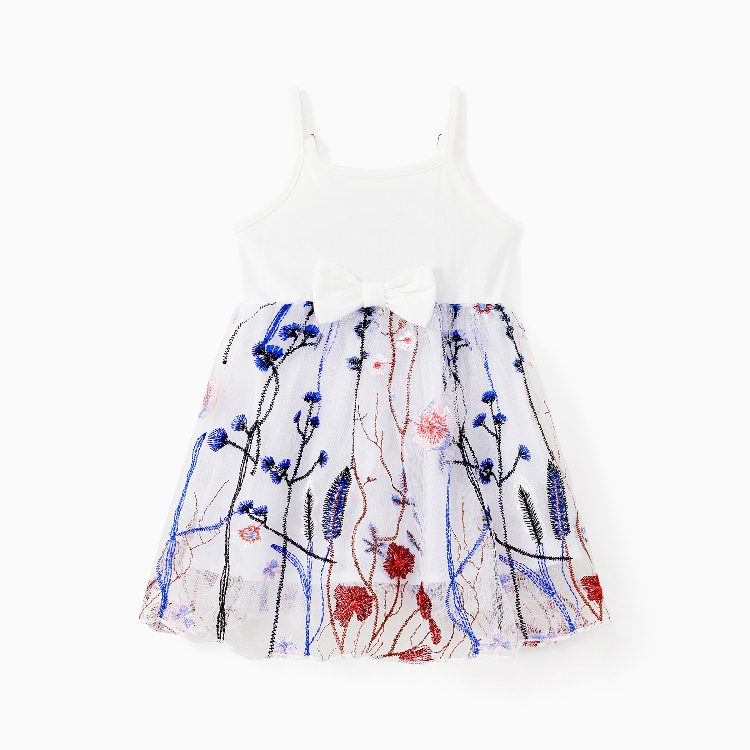 Product Introduction:Complete matching family set for a casual party.;Fabric:Tee: 95% cotton and 5% spandex; nDress: cami top-95% cotton and 5% spandex; tulle layers: one layer (embroidered) made of 100% polyester, the other (solid color) made of 100% nylon;;Care Instruction:Machine wash in cold water, do not dry clean or bleach. Low temperature ironing recommended.;Key Features:* Please add each size separately to your shopping cart. * Piece of product: Each size includes 1 dress or 1 tee * The dress has adjustable shoulder straps that allow you to customize the fit and length of the dress. * Product features: Matching family set. * Fabric characteristics: Comfortable and breathable. * Neckline: Round neck. * Sleeves: Sleeveless or short sleeves. * Style: Casual. * Fit: Regular fit. * Length: Knee-length for women and girls. *Source of goods: Imported. *Supplier: PatPat.;Additional information:Suitable for summer and any occasions including vacations, daily wear, work, and gatherings. Features a refreshing white color for a versatile look.;