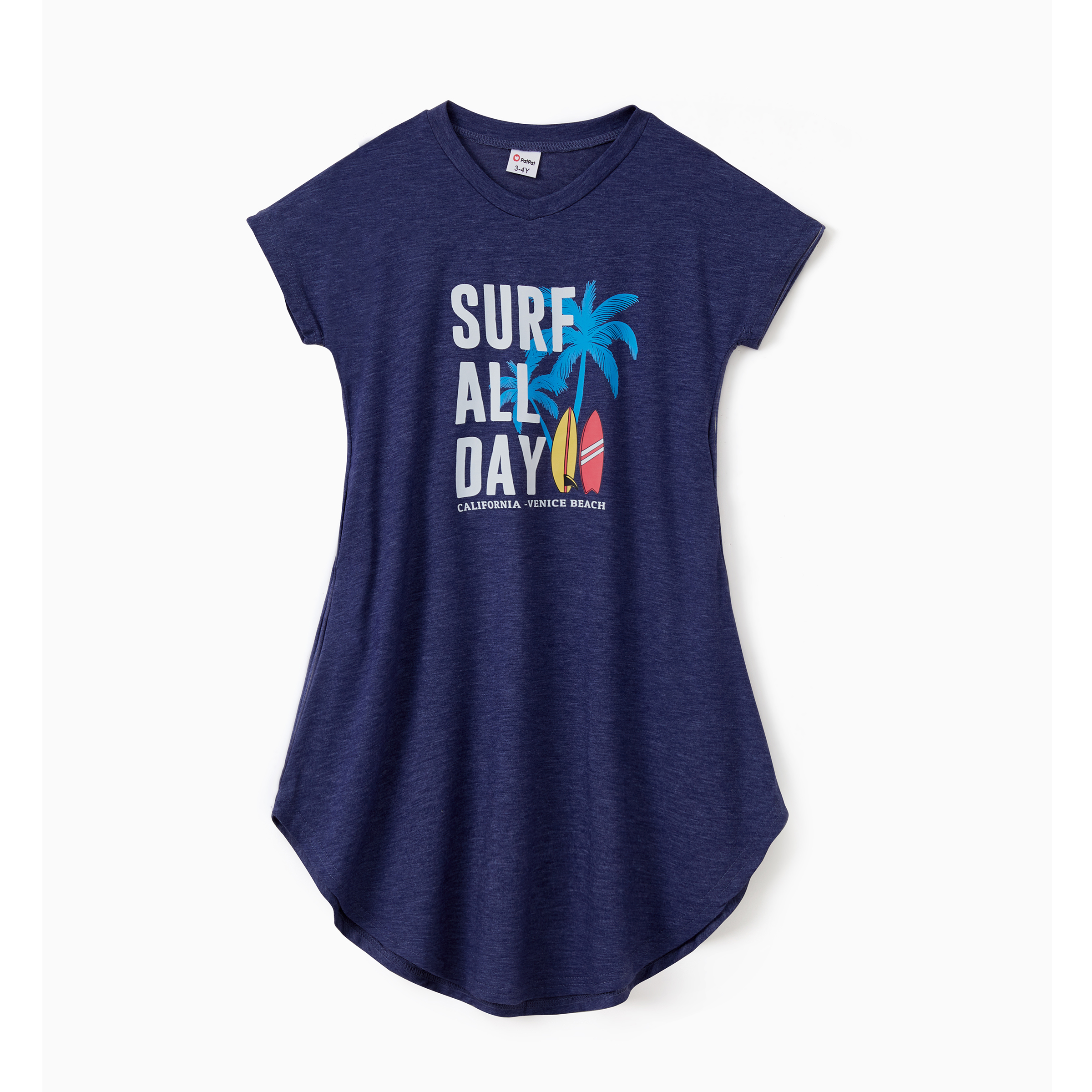 Family Matching Sets Deep Blue Coconut Tree and Slogan Printed Tee or Short Sleeves A-Line Dress With Pockets