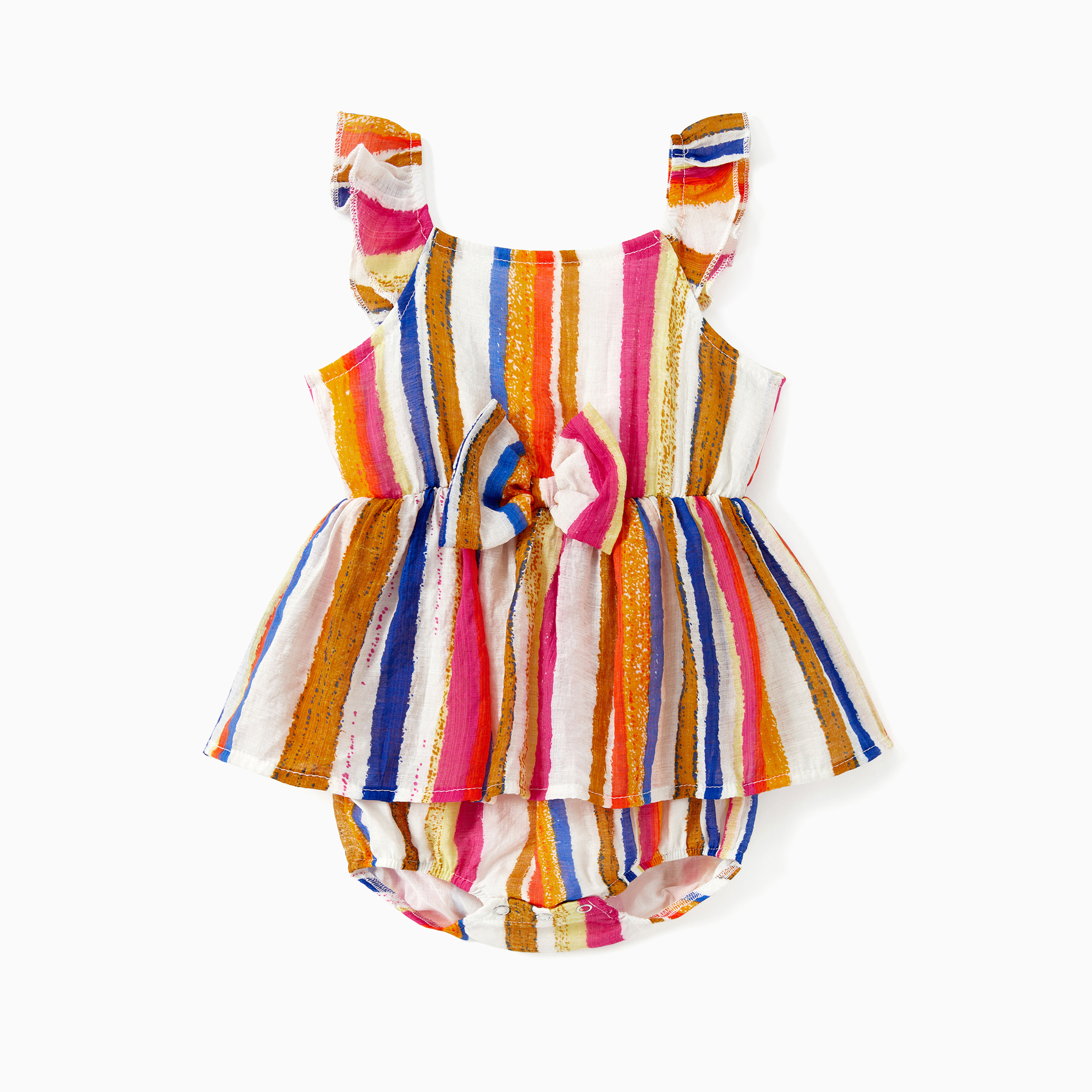 Product Introduction:Vibrant and playful, this matching family set featuring colorful vertical stripe prints and ruffled hemline is perfect for casual summer vacations.;Fabric:Dad/Boy: 95% Polyester, 5% Spandex; nMom/Girl/Baby Girl: 70% Viscose, 30% Nylon; Lining - 100% Cotton.;Care Instruction:Machine wash cold, do not dry clean or bleach. Low-temperature ironing is recommended.;Key Features:* Please add each size separately to your shopping cart * Piece of product: Each size includes 1 top, 1 dress, or 1 romper. * Product features: Matching family set with vertical stripes and ruffled hemline. * Fabric characteristics: Soft and comfortable fabric for easy movement. * Neckline: Dad/boy - round neck, Mom - halter neckline, girl - spaghetti strap, baby girl - square neckline. * Sleeves: Dad/boy - short sleeves, mom/girl/baby girl - sleeveless. * Style: Casual/vacation style with colorful stripe prints and ruffled hemline. * Fit: Regular fit. * Length: Knee length. * Source of goods: Imported. * Supplier: PatPat.;Additional Information:Suitable for summer vacations and casual outings. Perfect for families who love matching outfits.;