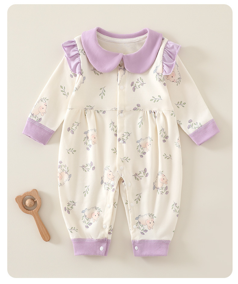 Baby Girl Long Sleeve Floral Romper – Soft Cotton Jumpsuit with Peter Pan Collar and Ruffle Shoulder Design