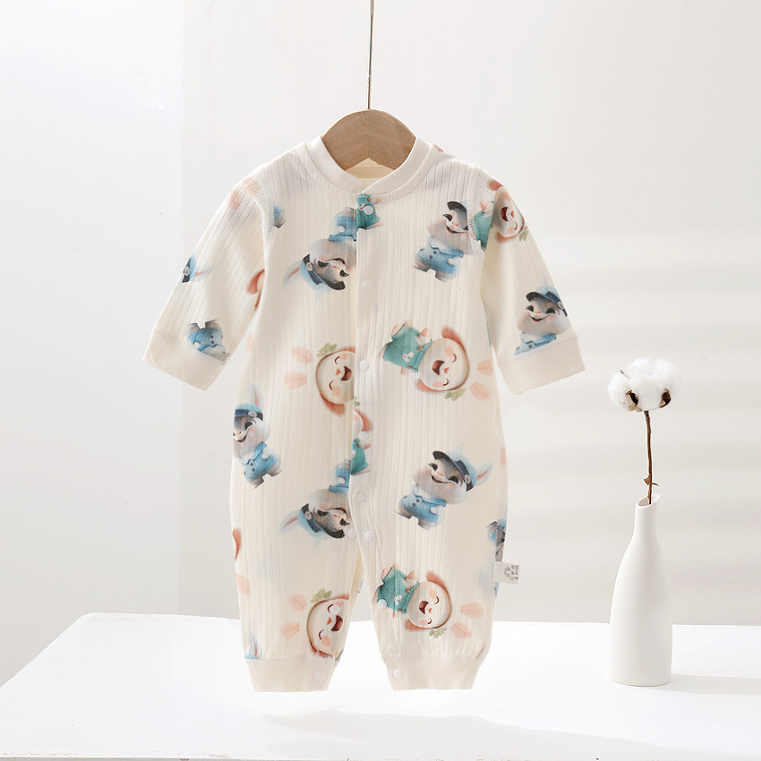 Baby Long Sleeve Cotton Romper with Cartoon Print – Soft Ribbed Jumpsuit for Newborns and Infants