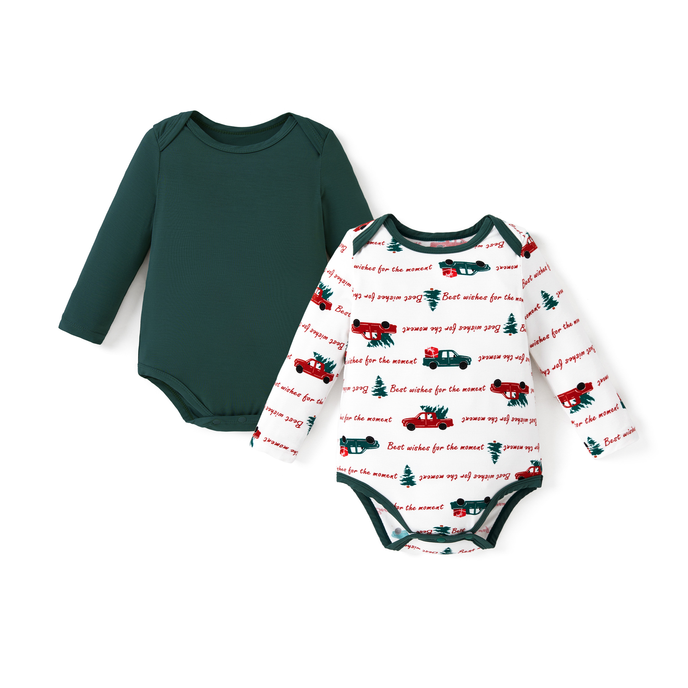 Tag-free comfort & lasting stretch: Tag-free back neck plus soft bindings and smooth seams reduce irritation. Ultra-fine knit stretches with wiggles and keeps shape wash after wash.;Fabric:93% Viscose Made from Bamboo, 7% Spandex;Care Instruction:Machine wash cold, gentle cycle, avoid bleach, tumble dry low.;Key Features:* Product features: Soft, stretchy, eco-friendly fabric, Value 2-pack, holiday-ready: One solid + one holiday truck print—gift-ready for baby showers, newborn arrivals, birthdays, and seasonal fun