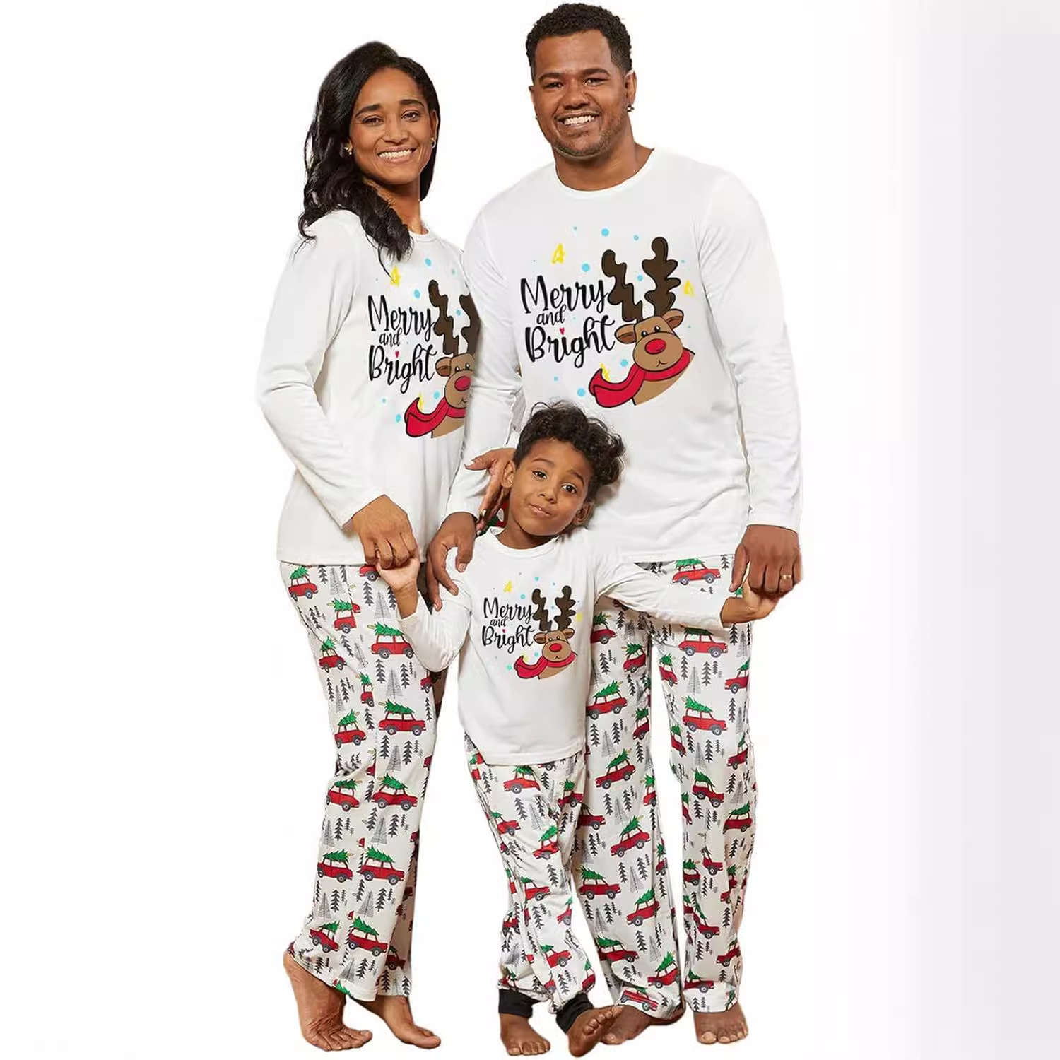 Christmas Family Matching White Letter & Elk Print Long-sleeved Pajamas Sets