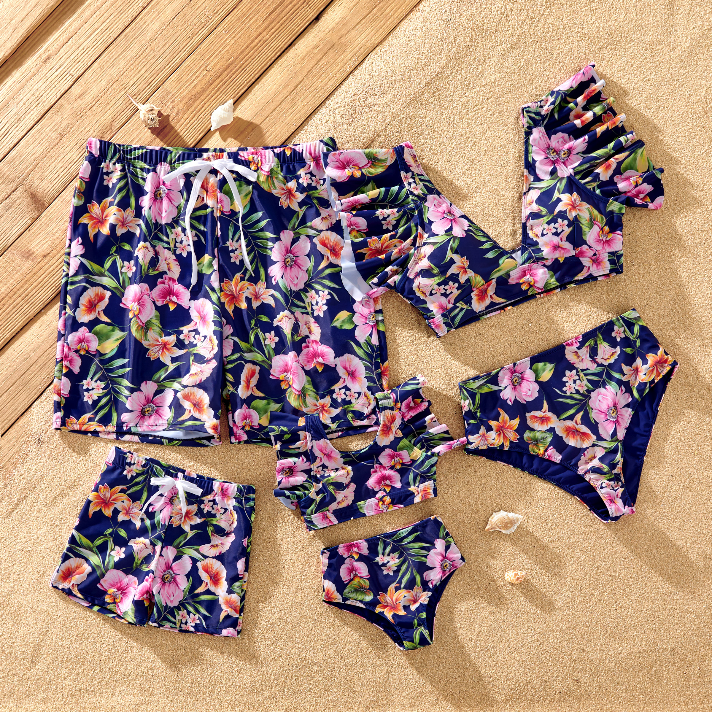 Family Floral Drawstring Swim Trunks or Reversible Flounce Sleeves Bikini