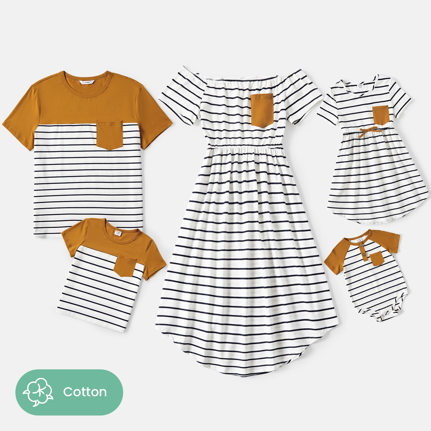 Family Matching 95% Cotton Striped Off Shoulder Belted Dresses and Short-sleeve Colorblock T-shirts Sets