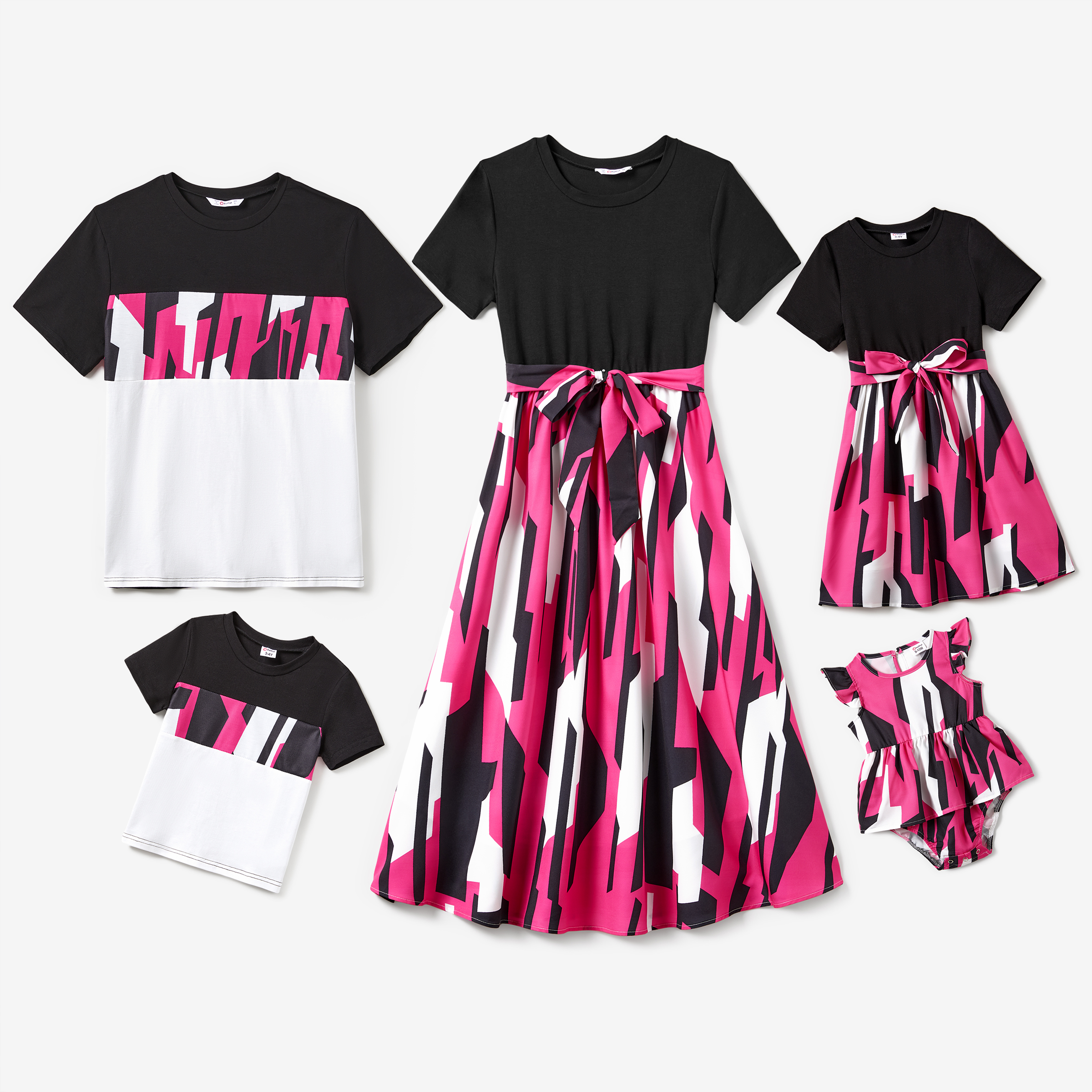 Product Introduction: A matching family set for summer featuring lightweight, moisture-wicking fabric that is perfect for casual wear. The set is matching with bold, abstract patterns in shades of pink, white, and black. Fabric: Dress: top-95% cotton and 5% spandex; bottom-100% polyester; Tee: 95% cotton and 5% spandex; Romper-100% polyester Care Instruction: Low-temperature ironing, cold water machine wash, do not dry clean or bleach. Key Features: *Please add each size separately to your shopping cart. *Each size includes 1 dress, 1 romper or 1 top *The dress has a black top with short sleeves and a round neckline. *Matching outfits for family *Moisture-wicking and lightweight *Short-sleeved *Casual style *Medium fit *Mid-calf length skirt *Imported *Supplier: PatPat Additional Information: Suitable for summer casual wear.