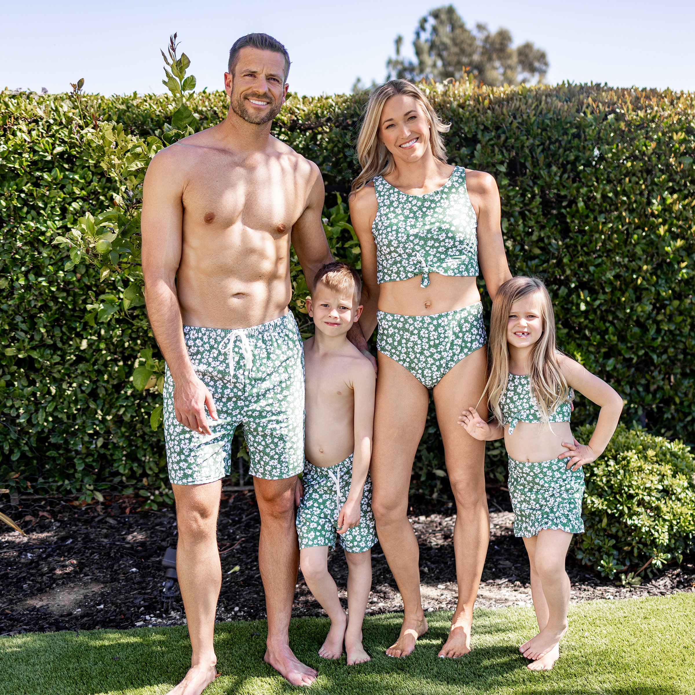Family Matching Daisy Print Green Swim Trunks or 3-piece Ruffle Swimsuit with Coverup Skirt