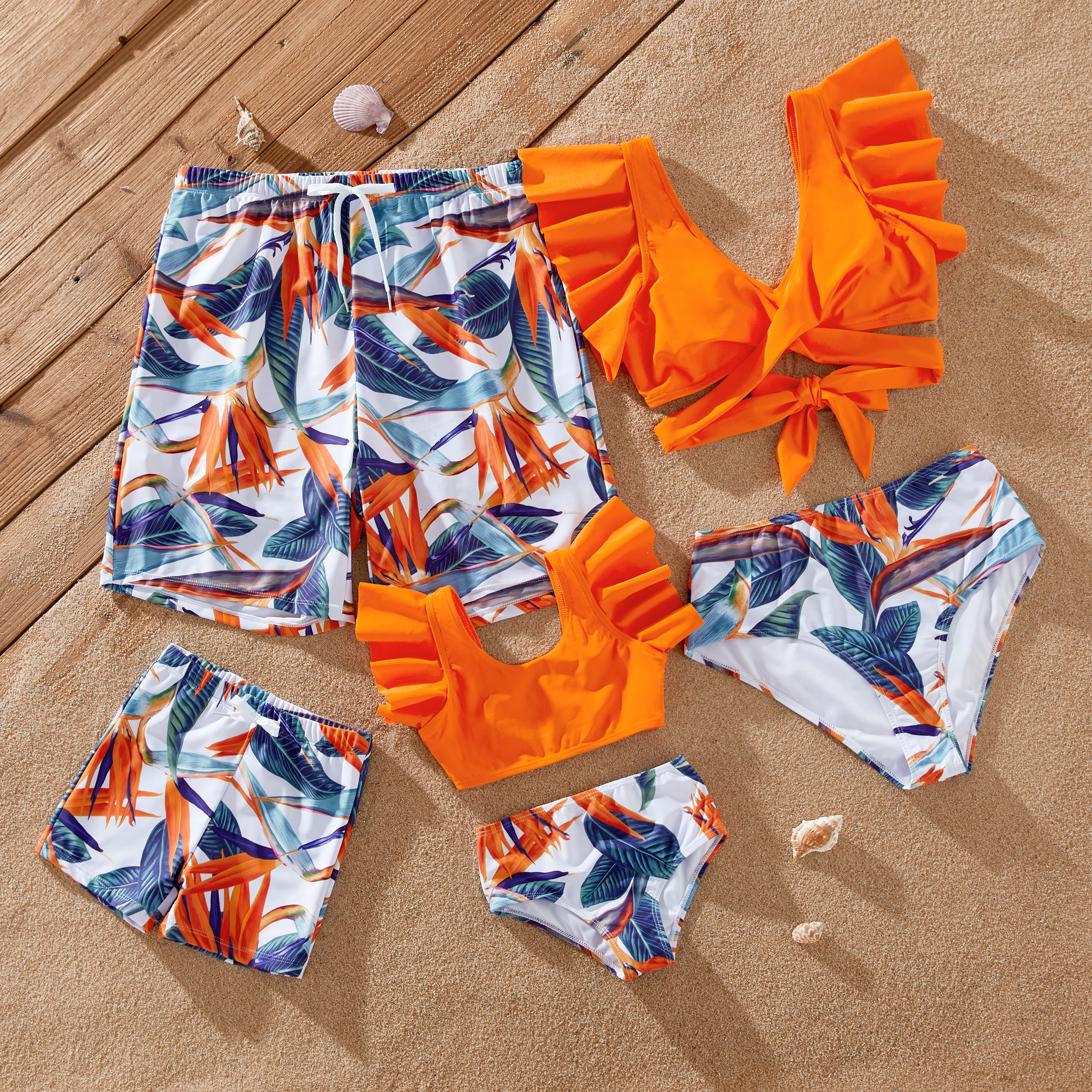 Product Introduction: Stylish and matching family swimwear set with a beautiful orange floral and leaf print, perfect for a summer holiday.