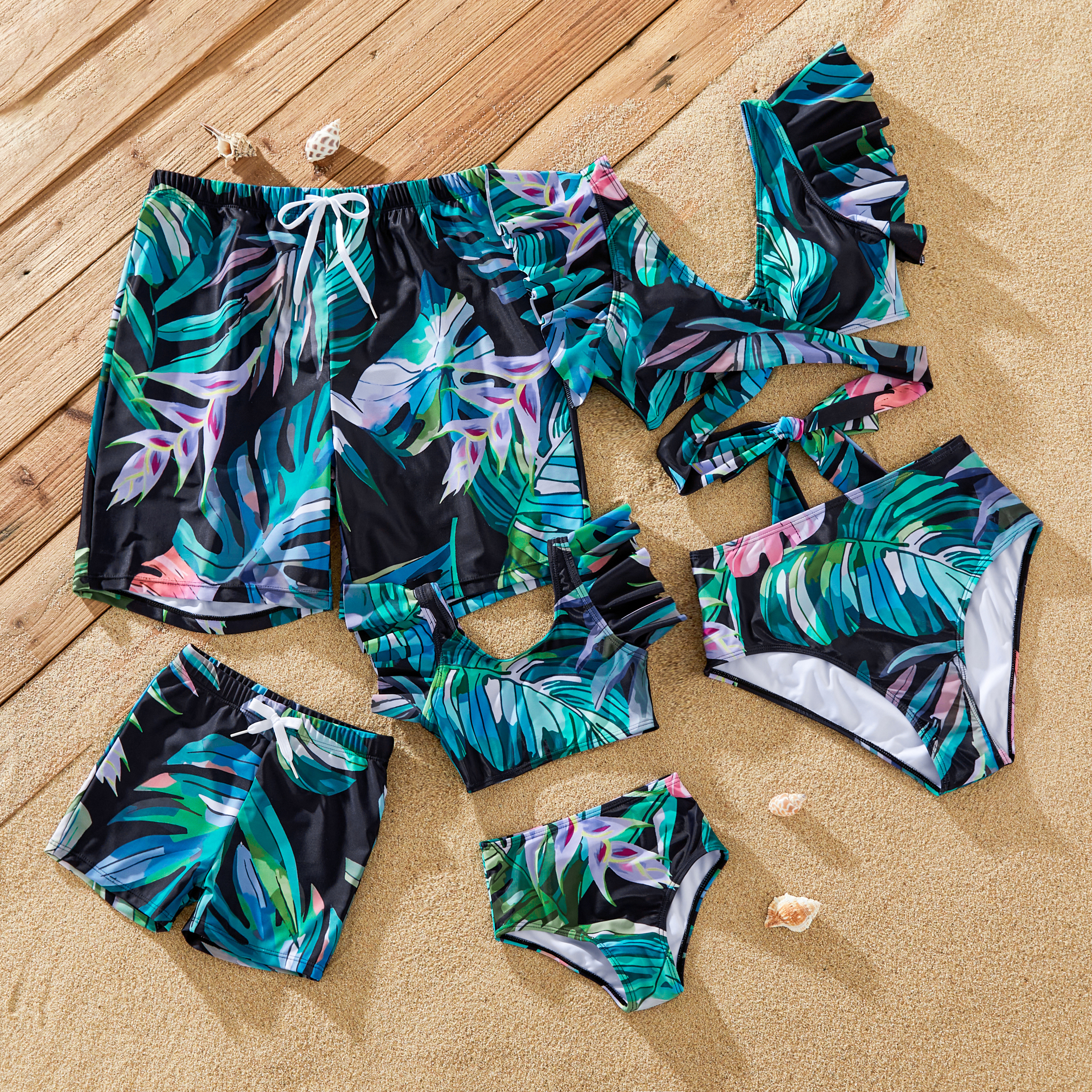 Product Introduction: Get the perfect family matching outfits for summer vacations and weekends. Fabric: Composed of 82% polyester and 18% spandex. Care Instruction: Machine wash in cold water, do not bleach, and avoid dry cleaning. Key Features: * Please add each size separately to your shopping cart. * Each size comes with either a set of bikini or a pair of swim trunks * Swim trunks with adjustable drawstring and elastic waist. * This bikini features adjustable cross tie on the back for a flattering fit on any body type. * This bikini has removable pads in the bust area. You can choose to wear the swimsuit with or without the removable pads, depending on your preference and mood. The pads are soft and flexible, enhancing your bust and silhouette. * Fabric is lightweight, soft, and waterproof * Neckline: V-neck for mom and round neck for girl * Sleeves: Frilled * Style: Casual * Fit: Suitable for all * Length: Regular * Source of goods: Imported * Supplier: PatPat Additional Information: Suitable for summer vacations and relaxing on the beach. Features black tree leaf prints, making it perfect for those who enjoy nature.