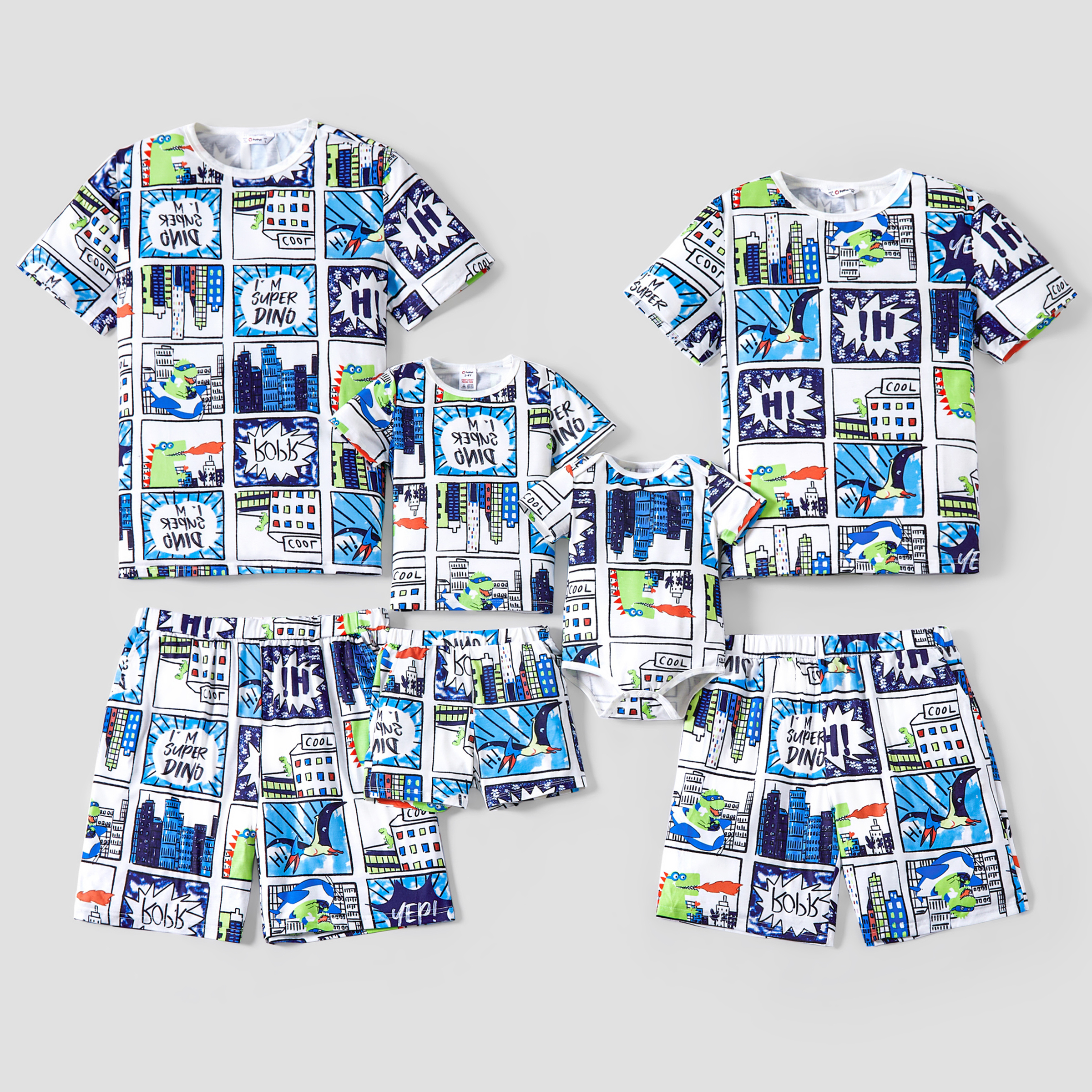 Product Introduction: Family set with dynamic comic-style fighting dinosaurs, creating a cozy and happy family atmosphere.;Fabric: Mom/Dad: 95% polyester, 5% spandex;
