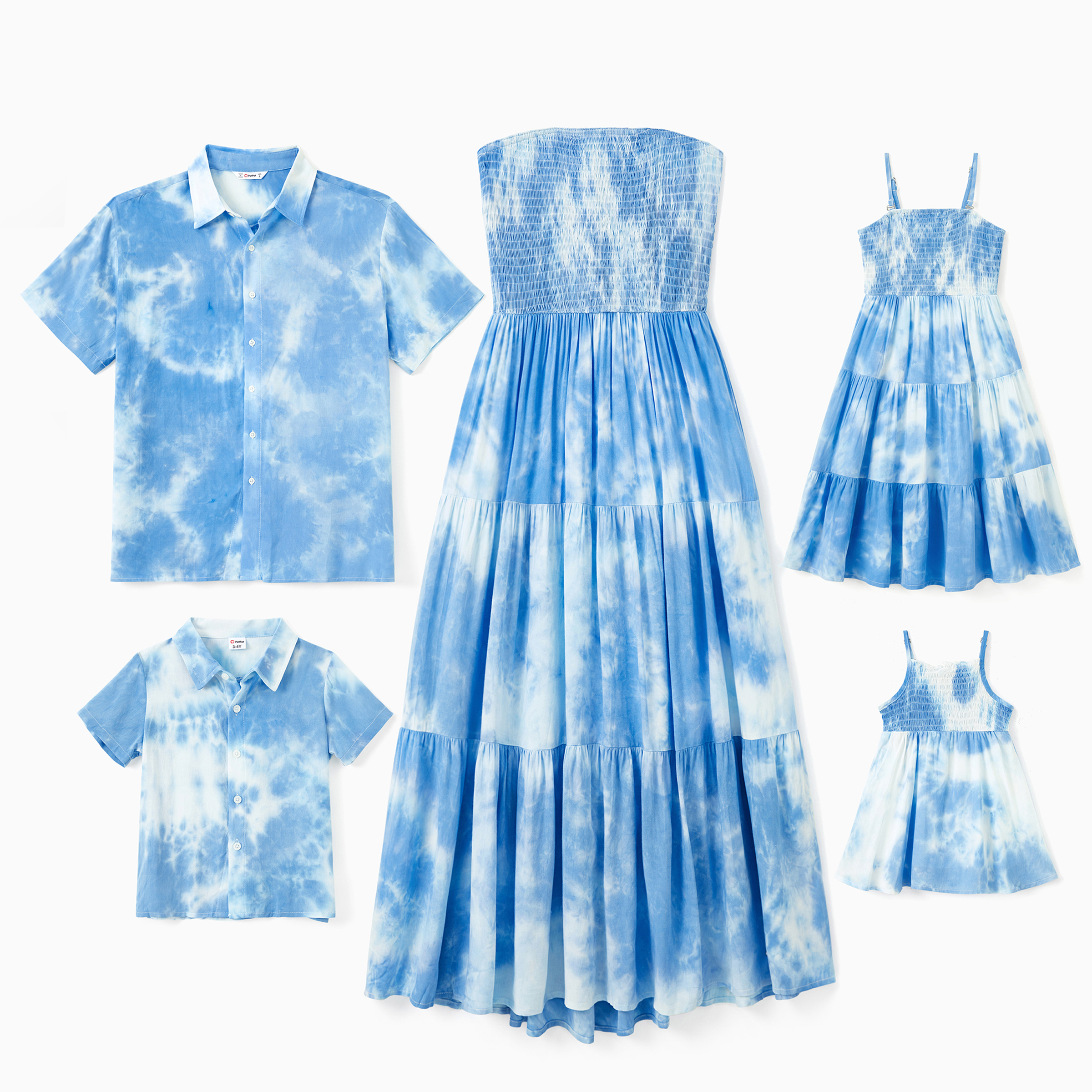 Product Introduction: Family matching outfits with blue tie-dye prints and flowy details for a casual and relaxed summer holiday.;Fabric: Made of 100% viscose for comfort and softness.;Care Instruction: Machine wash in cold water, do not dry clean or bleach, iron at low temperature.;Key Features: * Please add each size separately to your shopping cart. * Each size includes 1 top, 1 dress, or 1 romper * Product features: Family matching outfits. * Fabric characteristics: Comfortable and soft viscose material. * Neckline: Men and boys with a shirt collar, women with a strapless design, girls and babies with thin spaghetti Straps. * Sleeves: Short sleeves / sleeveless. * Style: Casual and holiday. Blue tie-dye prints, shirred top, and flowy hemline. * Fit: Moderate fit. * Length: Regular. * Source of goods: Imported. * Supplier: PatPat.;Additional Information: Suitable for summer and suitable for casual and holiday occasions. Features blue tie-dye prints and flowy hemlines.