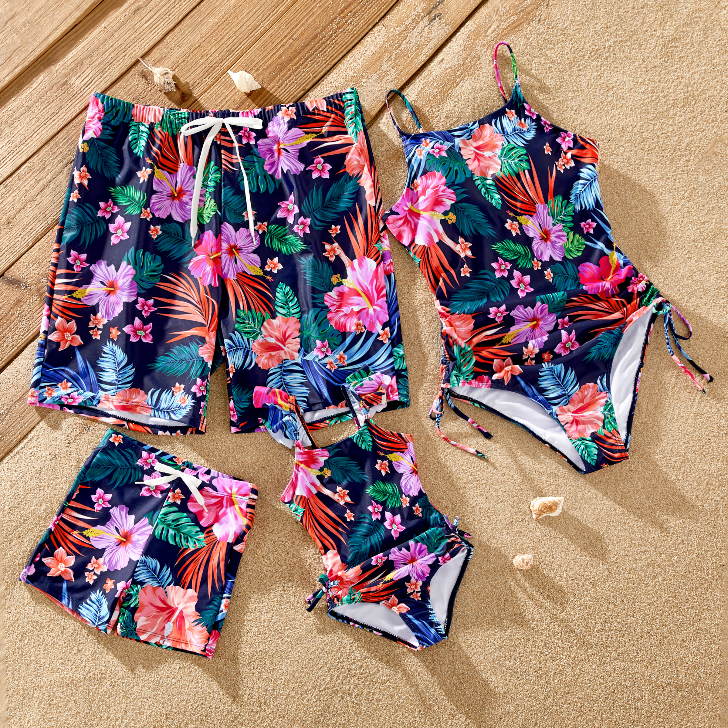 Family Matching Tropical Floral Print Swimwear Set Design: Coordinated tropical floral print swimwear for the whole family! ·Dad & Kid: Quick-dry shorts with drawstring waist for a secure fit. ·Mom & Baby: Stylish one-piece swimsuits — Mom’s suit has side ties for adjustable styling; Baby’s suit features a cute cutout back detail. Material: 82% Polyester + 18% Spandex — Soft, stretchy, and quick-drying, ideal for beach days, pool parties, or tropical getaways. Please add each size separately to the cart. Piece: 1 pc per item (e.g., 1 pc = Dad’s shorts; 1 pc = Mom’s swimsuit).