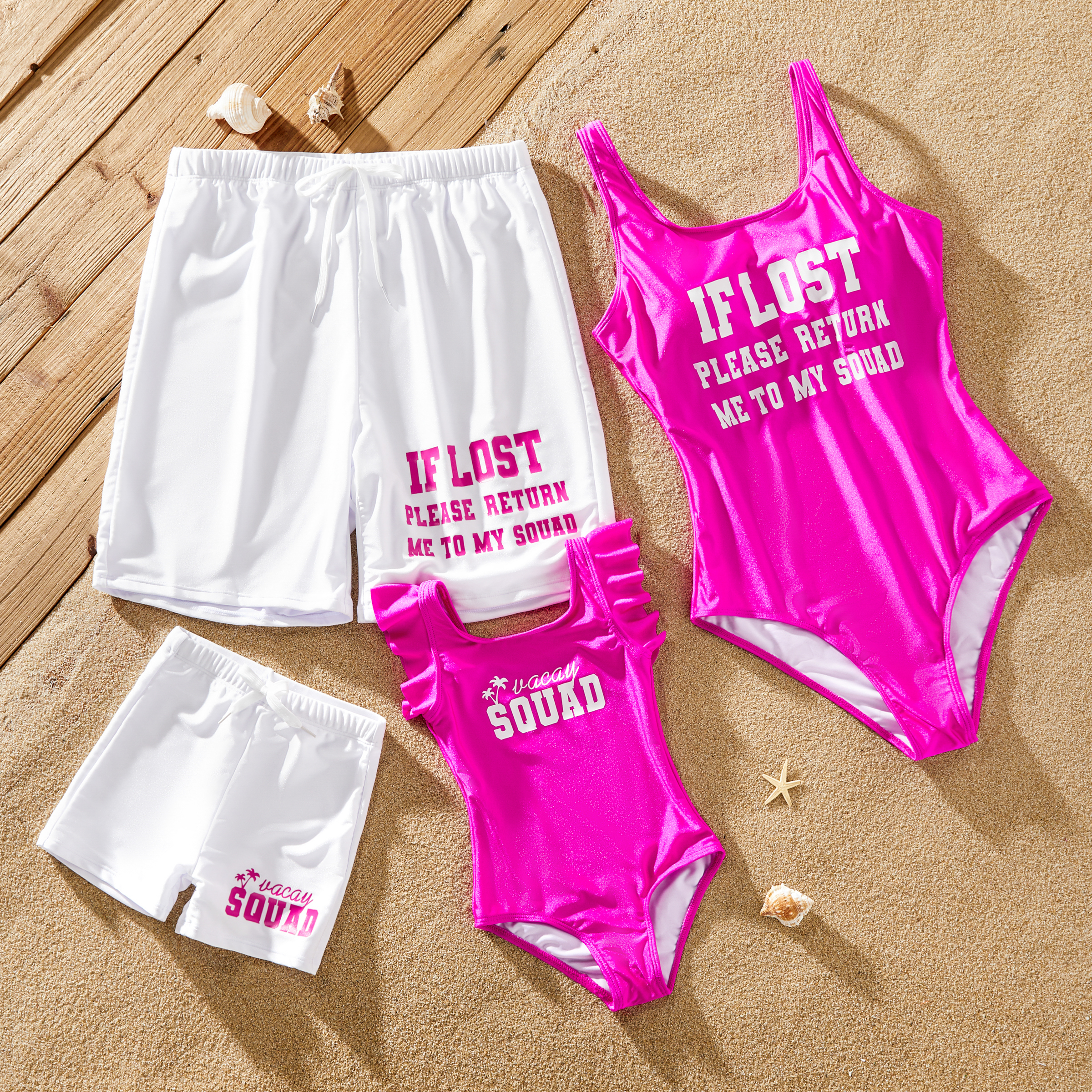 Product Introduction: SQUAD print white swim trunks and hot pink one-piece swimsuit for parent-child matching outfits. Stand out in the summer sun! Fabric: Made of 82% nylon and 18% spandex, with a smooth and glittering surface that shimmers in the sunlight. Care Instruction: Low-temperature ironing, do not dry clean, machine wash in cold water, do not bleach. Key Features: * Please add each size separately to your shopping cart * Piece of product: Each size includes only a one-piece swimsuit or a pair of swim trunks * Product features: Family matching outfits * Fabric characteristics: glittering surface * Neckline: round neck * Sleeves: sleeveless * Style: casual/fashion (bright colors and trendy design) * Fit: tight * Length: standard length * Source of goods: imported * Supplier: PatPat Additional Information: Suitable seasons: summer Suitable occasions: casual/fashionable outings Product design: SQUAD print, hot pink color.