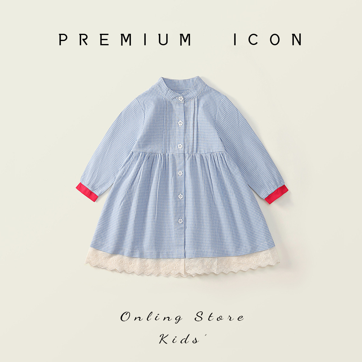 Girls' Checkered Long Sleeve Dress with Lace Trim for Fall/Winter