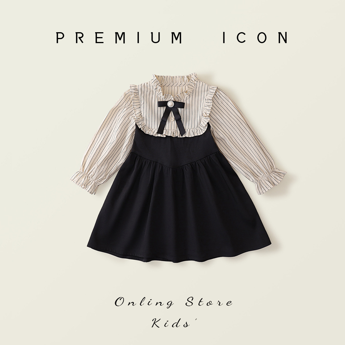 Girls' Navy and Striped Dress with Ruffled Collar and Bow Detail