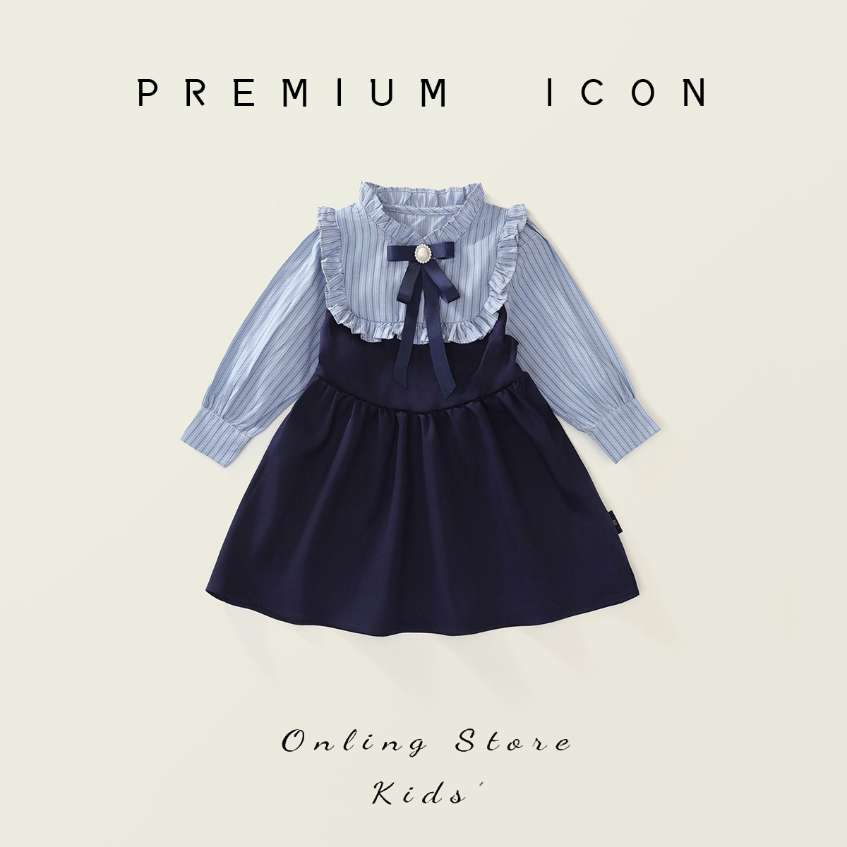 Girls' Navy and Striped Dress with Ruffled Collar and Bow Detail