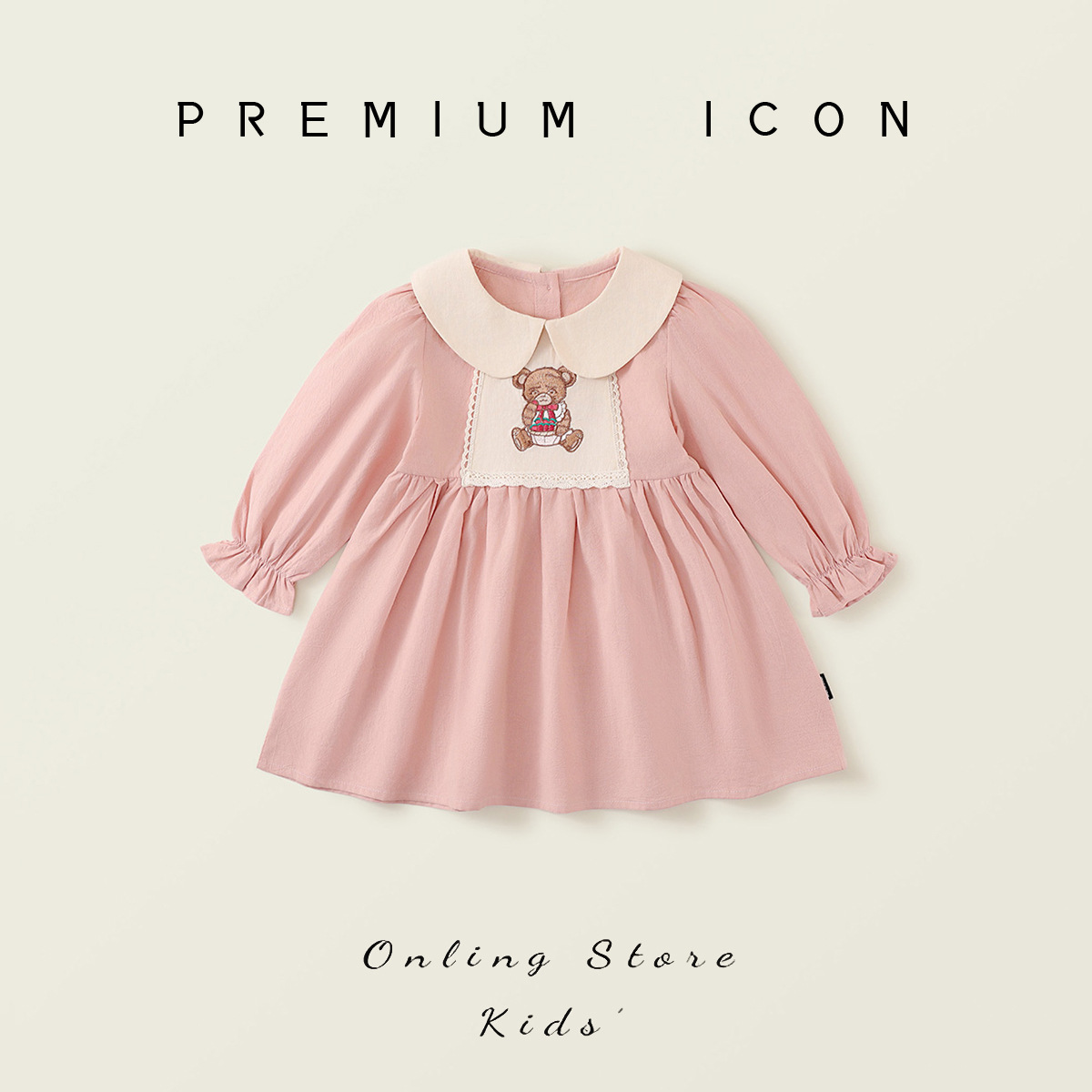 Girls' Navy Dress with Rabbit Embroidery and Lace Collar