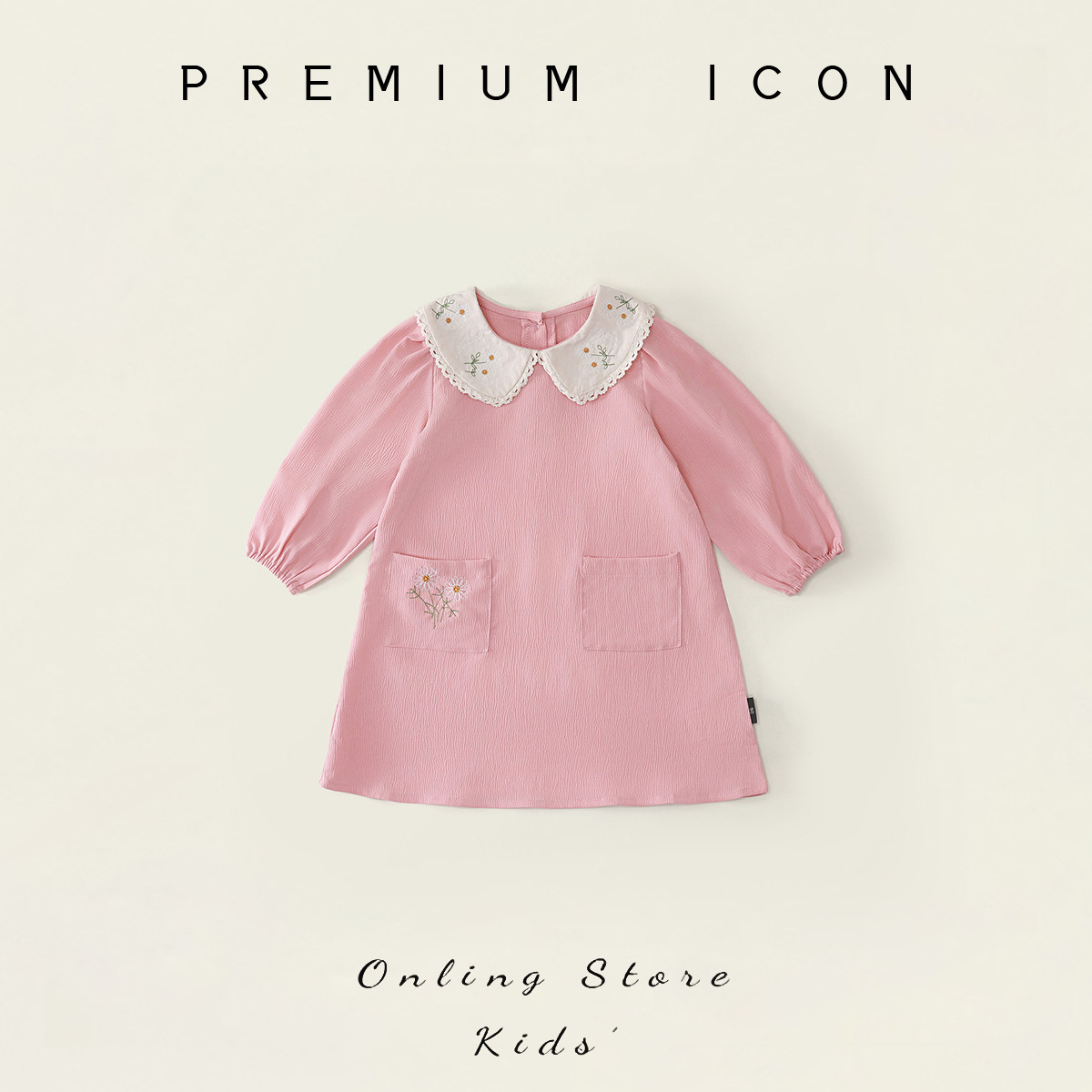 Girls' Pink Dress with Embroidered Flower Pockets and Ruffled Collar