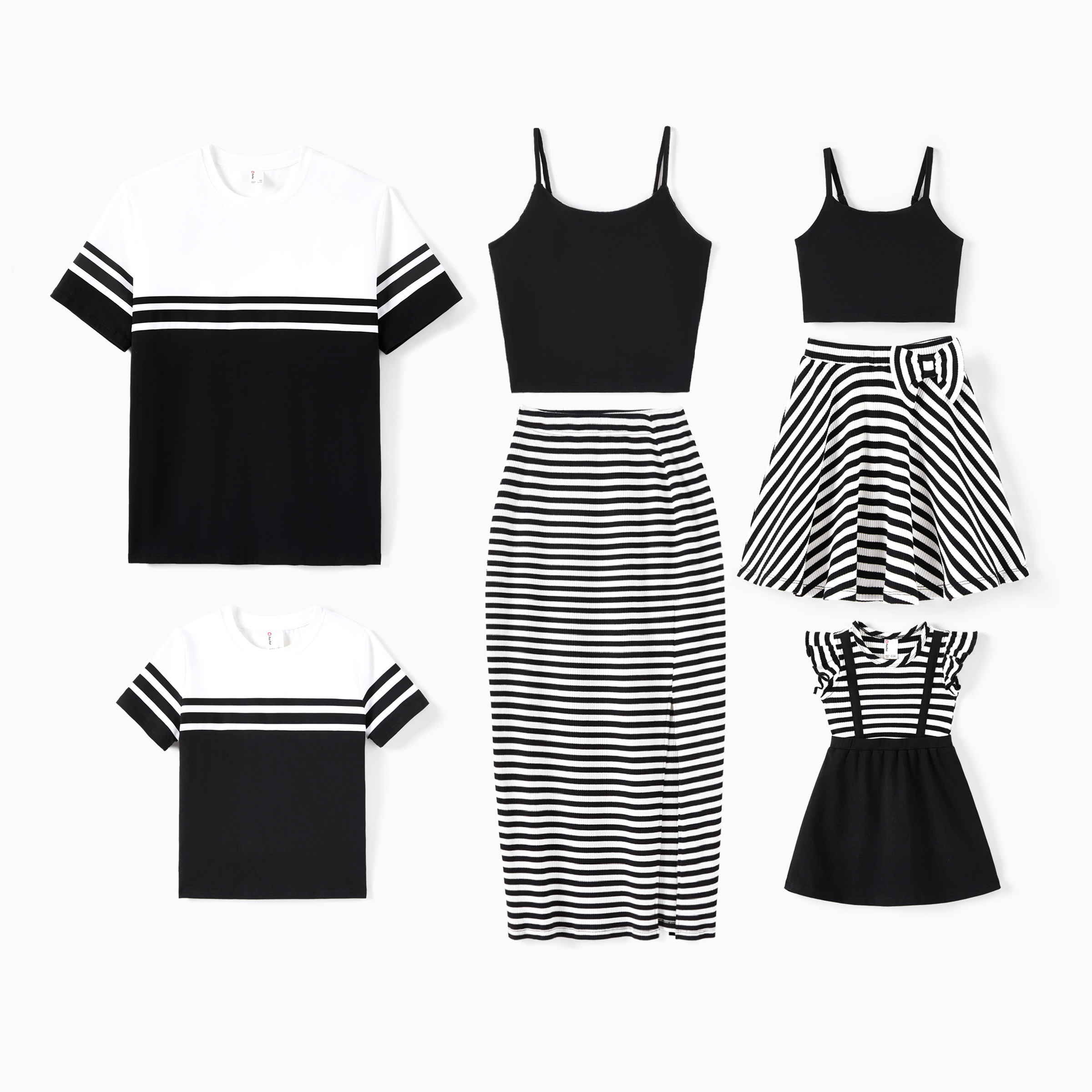 Product Introduction: Vibrant family set with matching striped outfits suitable for all occasions, appealing to impulse buyers.;Fabric: Cotton 95%, Spandex 5%;Care Instruction: Machine wash cold, gentle cycle. Tumble dry low.;Key Features: * Product features: Matching family outfits in bold striped designs. * Fabric characteristics: Comfortable and soft cotton-spandex blend. * Piece of product: Each size includes a dress or romper. * Neckline: Round neck for men's and girls' tops, spaghetti straps for women's. * Sleeves: Sleeveless. * Style: Casual/vacation style with elastic waist for adjustable fit. * Fit: Regular T-shirt length, mid-calf skirt length. * Length: Long dress. * Source of goods: Imported. * Supplier: PatPat;Additional Information: Suitable for spring/summer/fall/winter, perfect for casual, daily, office, outing, party, vacation, featuring unique, vibrant striped designs.
