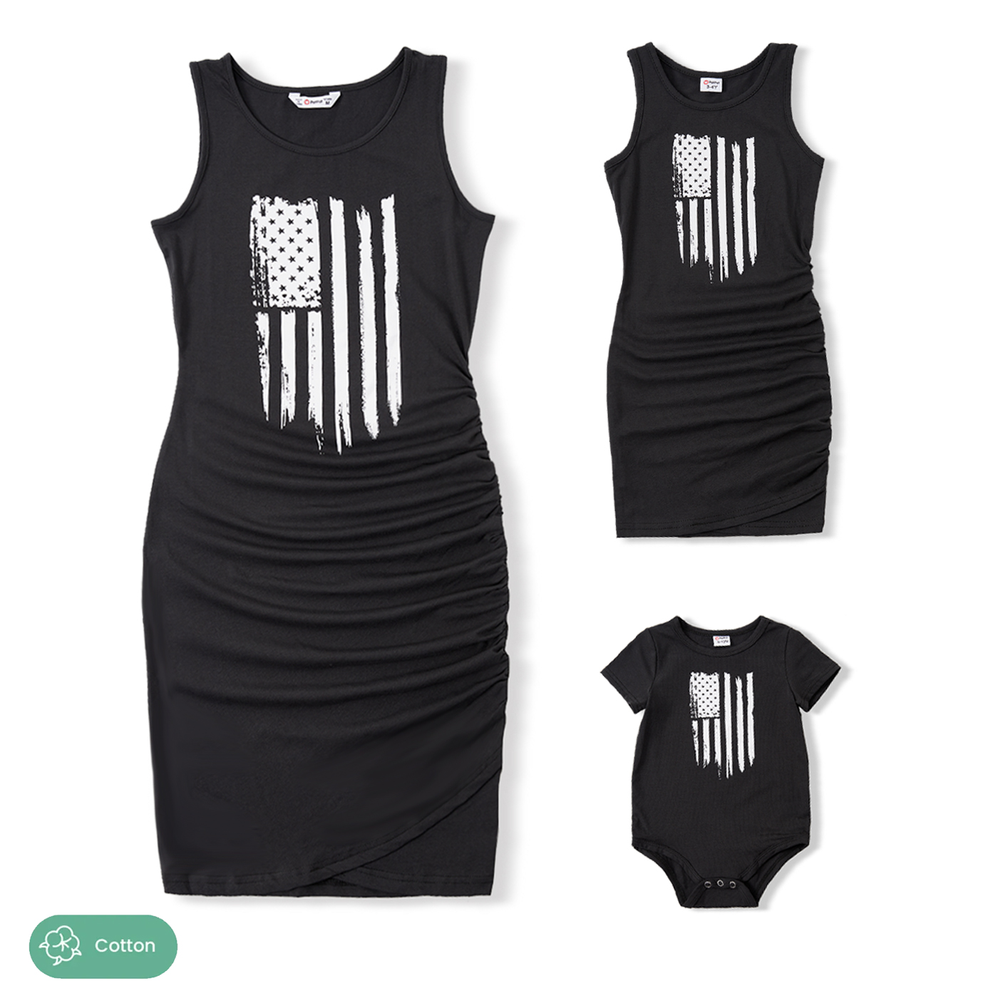 * Supplier: PatPat.;Additional Information: Perfect for summer, these matching outfits are ideal for casual wear, holidays, parties, and festival celebrations. The black and white American flag pattern, ruched, sleeveless dress is the perfect design for any patriotic occasion.
