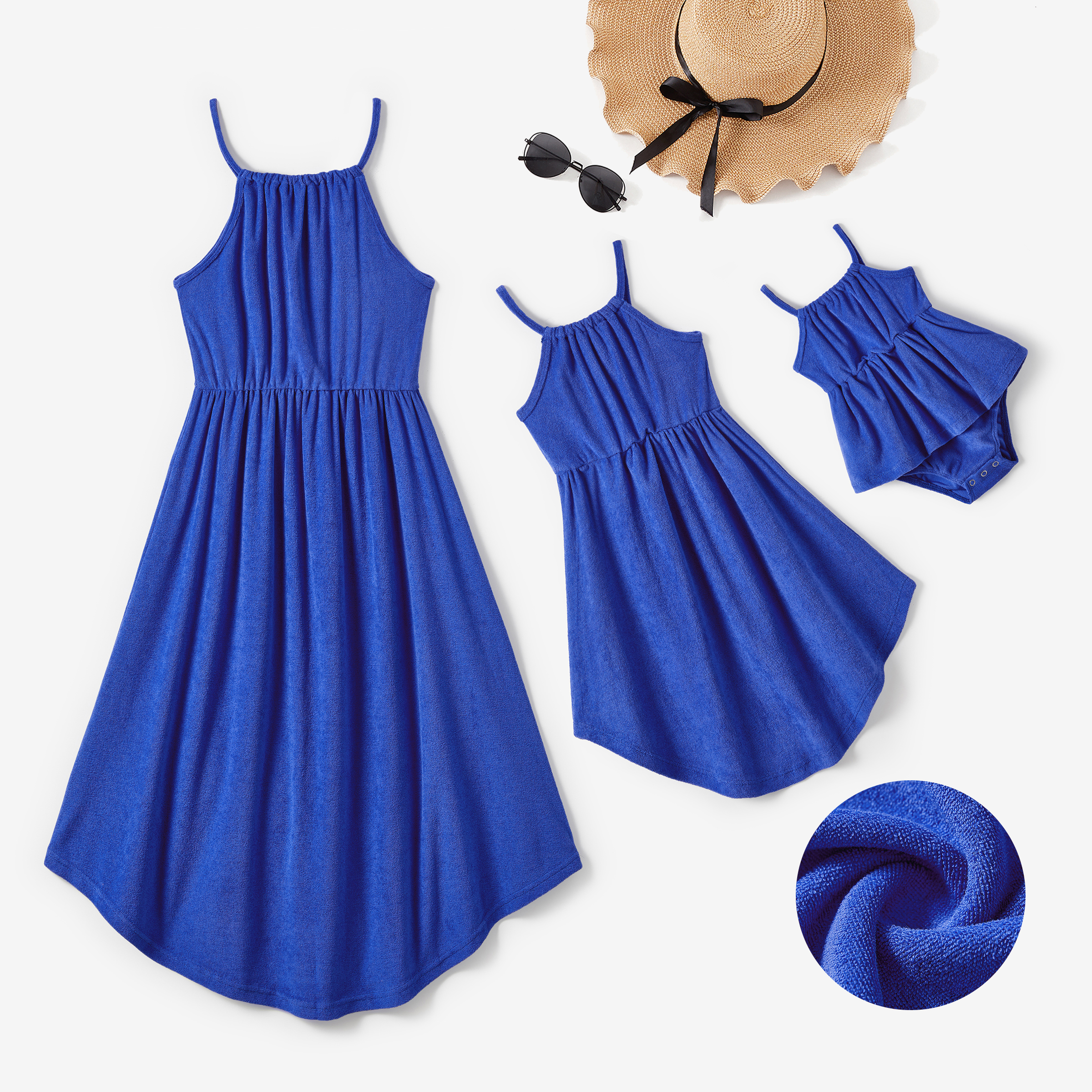 Mommy and Me Blue Terry Pleated Strap Dress
