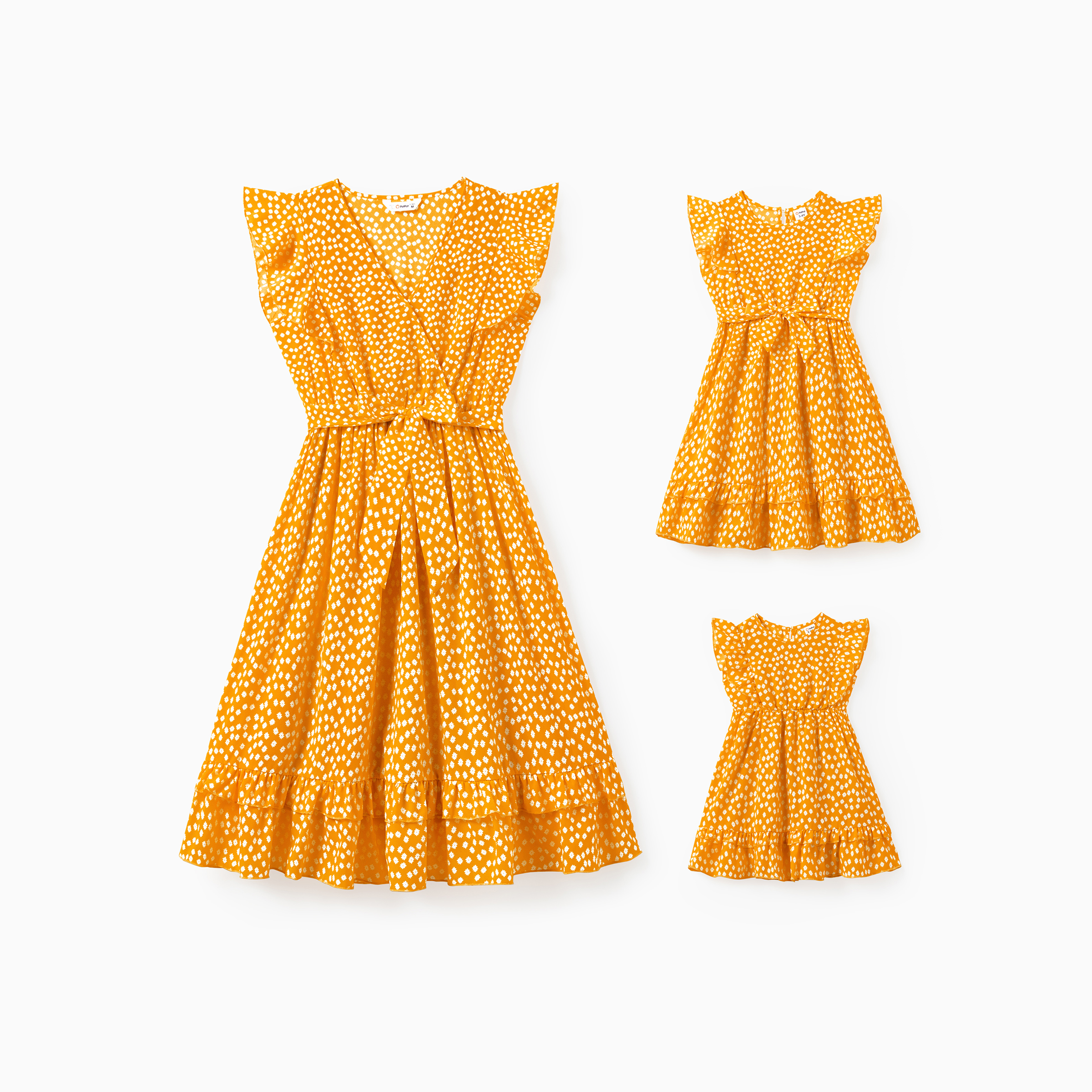 Product Introduction: Matching outfits in yellow floral design.;Fabric: Made of 100% polyester with 100% cotton lining.;Care Instruction: Low-temperature ironing. Do not dry clean. Machine wash in cold water. Do not bleach.;Key Features: * Please add each size separately to your shopping cart. * Product features: matching outfits for mommy and mini * Fabric characteristics: lined with soft cotton material * Piece of product: Each size includes 1 dress * Neckline: V-neck with hidden button design * Sleeves: sleeveless * Style: casual/fashionable with ruffled hemline * Fit: Regular fit * Length: knee-length * Source of goods: imported * Supplier: PatPat;Additional Information: Suitable for summer, perfect for vacation, work, travel, and gatherings.